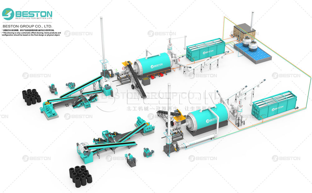 比如我们这个间歇式工艺的BLJ-16型号,日处理15吨左右的轮胎,给客户设计的方案就好几个。有的是普通上料方式,有的是液压上料方式,有的是螺旋进料方式,有的还需要二拖一结构,有的需要预处理设备,还有需要搭配轮胎油蒸馏设备等。